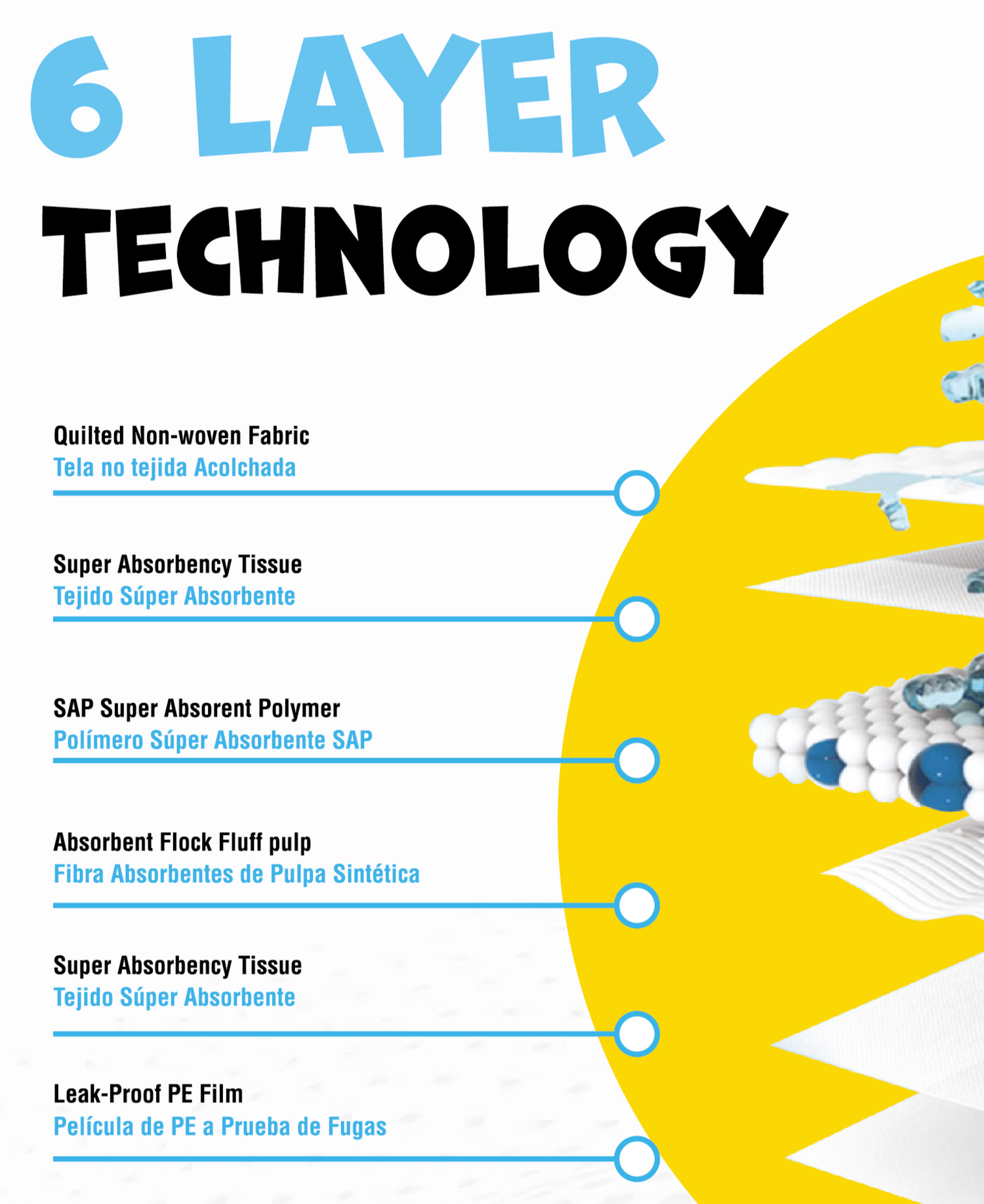 En el mercado actual, nuestros pads destacan como la mejor opción gracias a una tecnología innovadora que garantiza una absorción superior y máxima seguridad. Cada pad está diseñado con 6 capas de avanzada ingeniería de materiales, cuidadosamente seleccionadas para ofrecerte una experiencia incomparable.